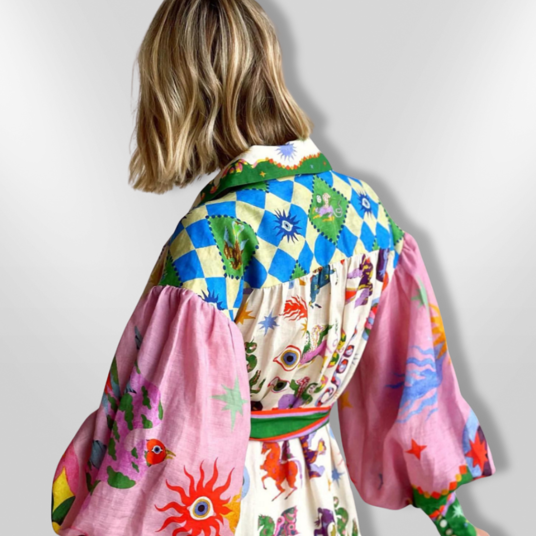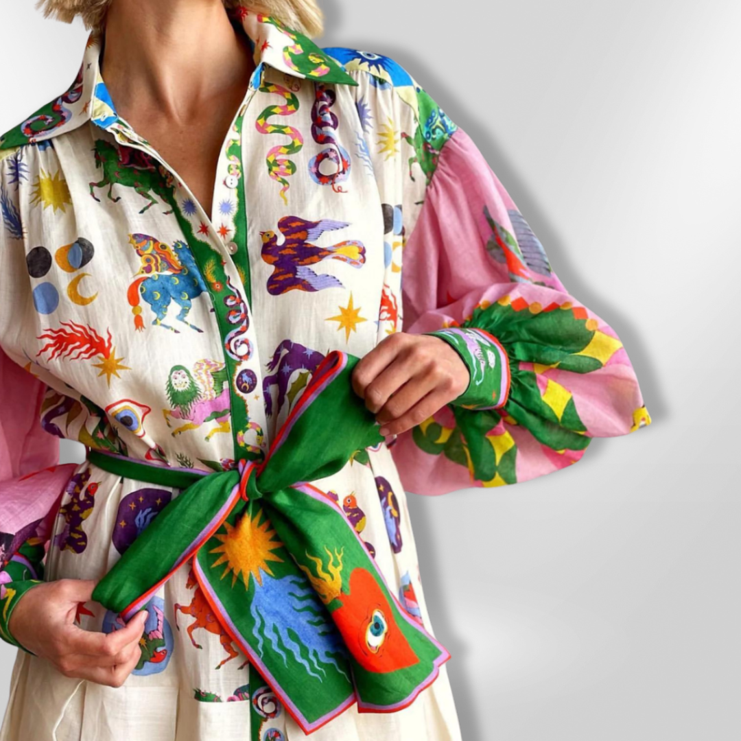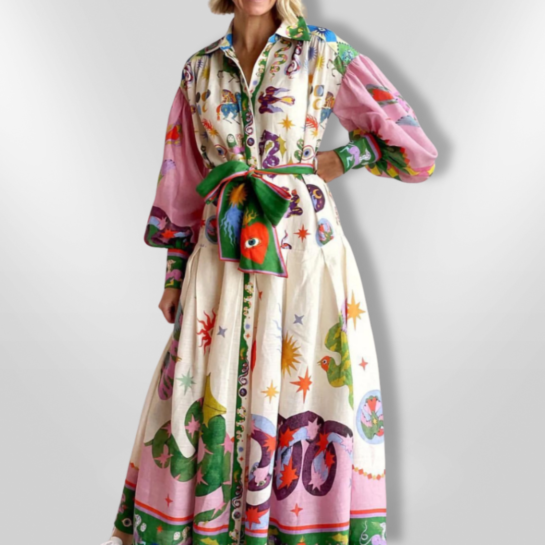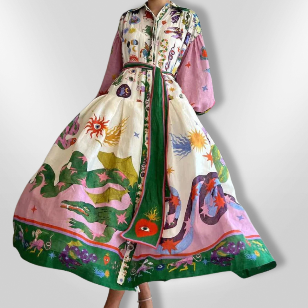 The VERA | Italian maxi dress is a stunning statement piece that combines bold artistic patterns with effortless elegance. With a vibrant print, voluminous sleeves and a flattering waistband, this dress is perfect for those who love unique and luxurious fashion. Whether for a chic daytime look or a chic occasion, the VERA dress embodies Italian sophistication.