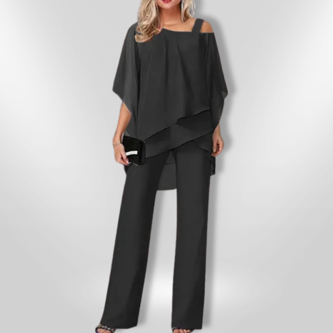 The AURÉLIE | Elegant Set is the epitome of sophistication, perfect for special occasions or refined evening wear. Featuring a flowing asymmetrical top with a chic cold-shoulder design and sleek wide-leg pants, this set offers effortless elegance and comfort. Its timeless black color and flattering silhouette make it a must-have for any fashion-forward wardrobe.