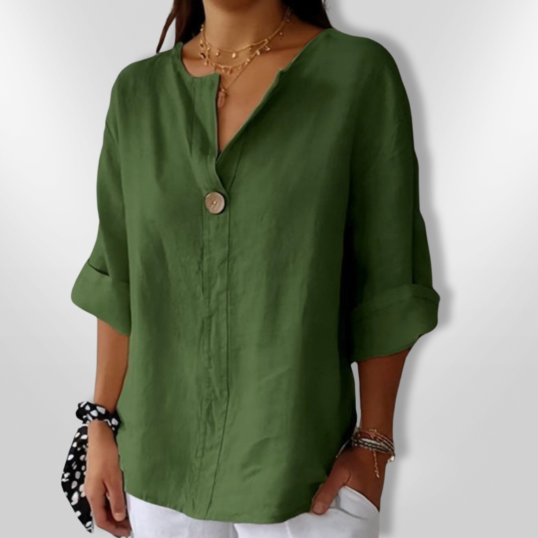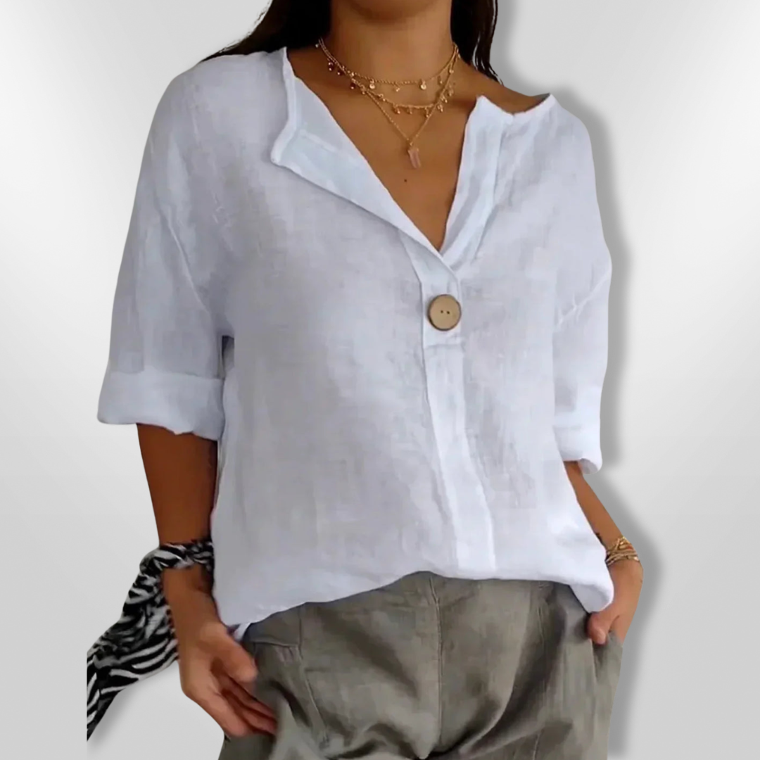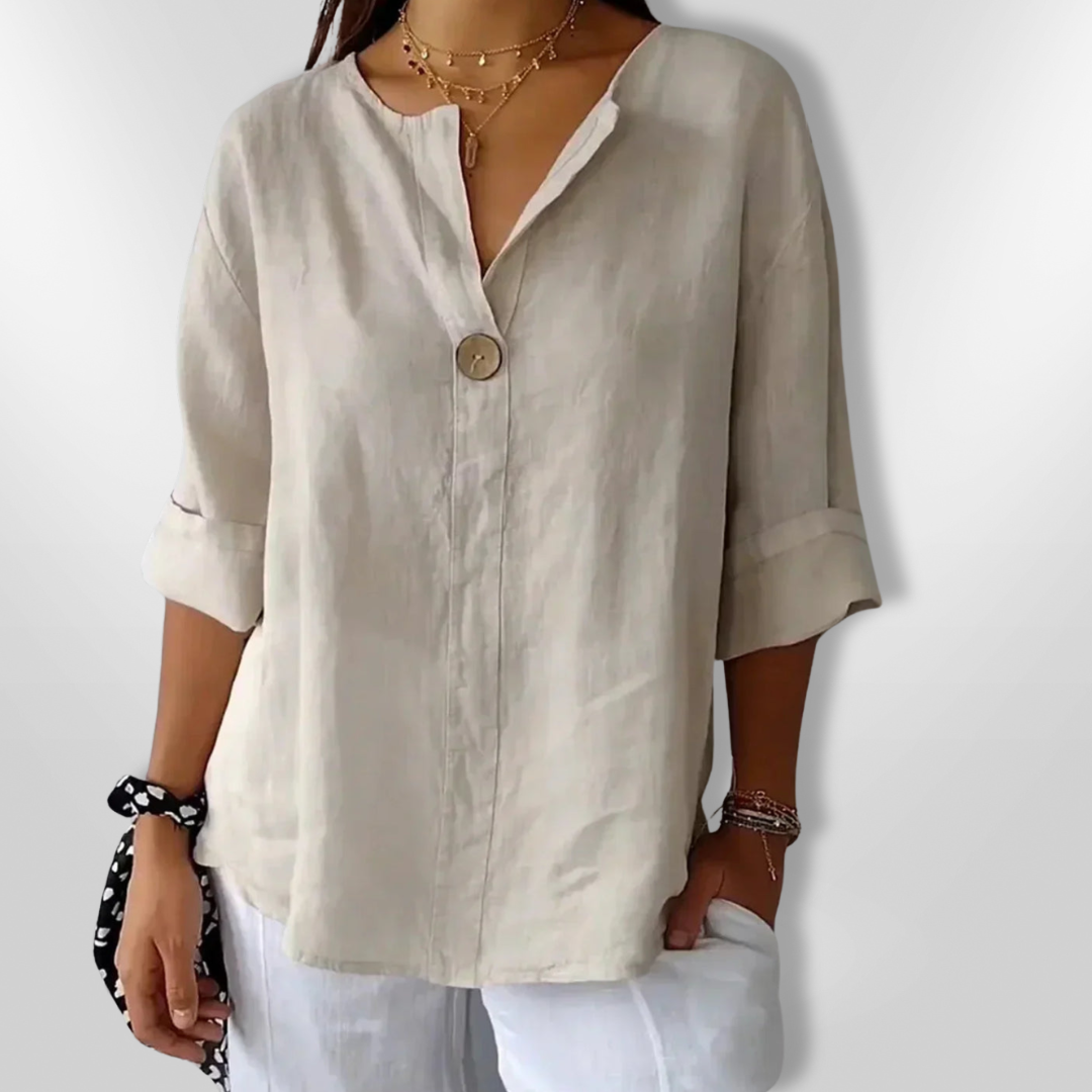 The JESSA V-neck Casual Blouse embodies effortless elegance, combining minimalist charm with everyday comfort. With its relaxed fit, soft linen-like fabric and elegant button details, this blouse is perfect for both casual outings and refined looks. The neutral shade and flowing silhouette make it a versatile essential for any wardrobe.