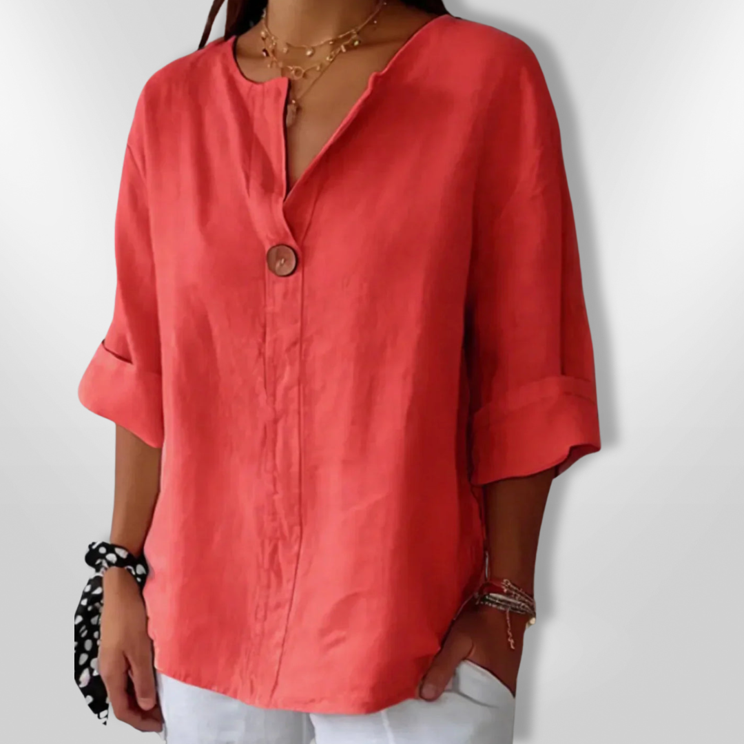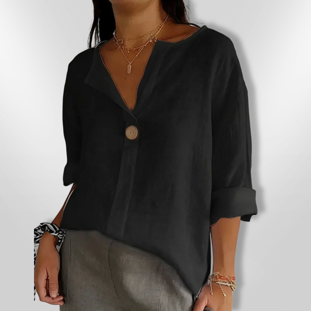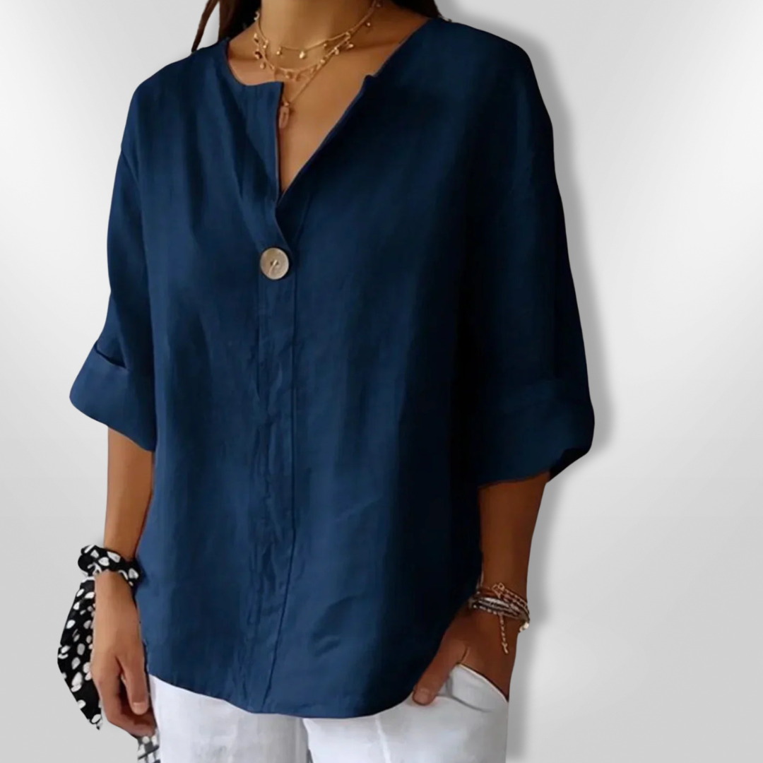 The JESSA V-neck Casual Blouse embodies effortless elegance, combining minimalist charm with everyday comfort. With its relaxed fit, soft linen-like fabric and elegant button details, this blouse is perfect for both casual outings and refined looks. The neutral shade and flowing silhouette make it a versatile essential for any wardrobe.