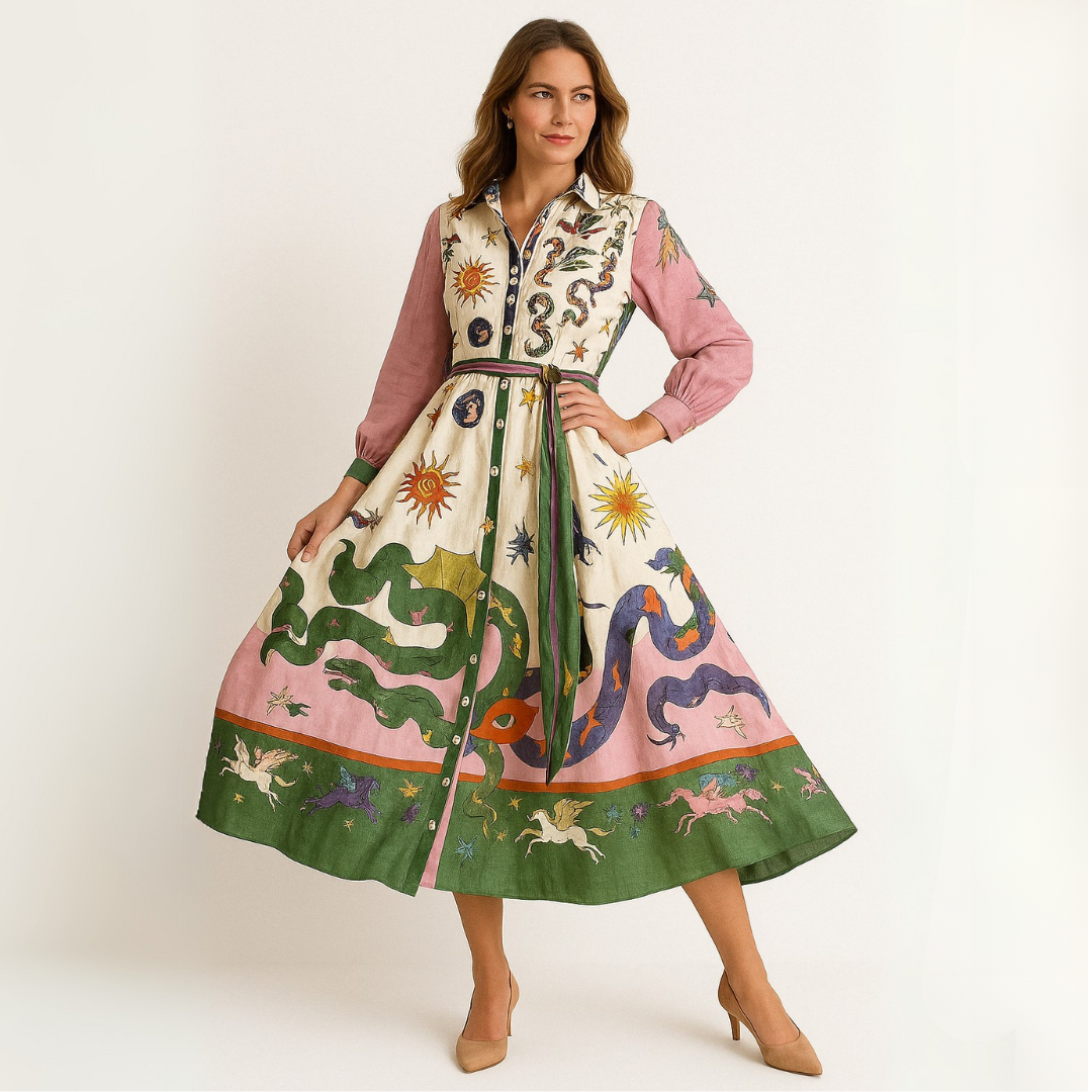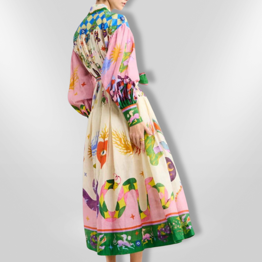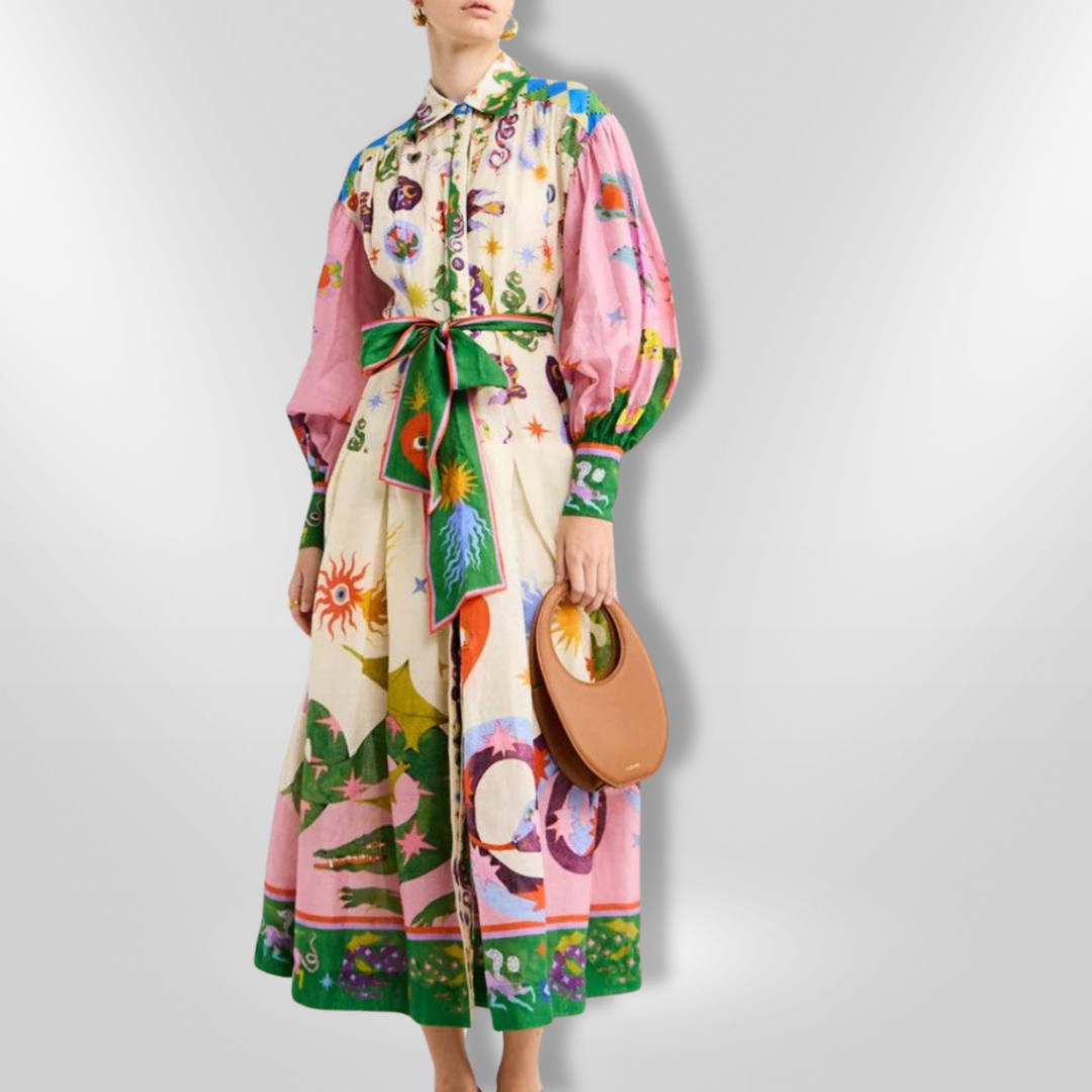 The VERA dress is a striking piece that combines bold artistic motifs with effortless elegance. With a vibrant print, voluminous sleeves and a belted waist, this dress is perfect for lovers of unique and luxurious fashion. Whether for a chic daytime look or a chic event, the VERA dress embodies Italian sophistication.