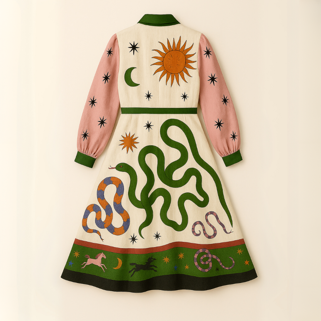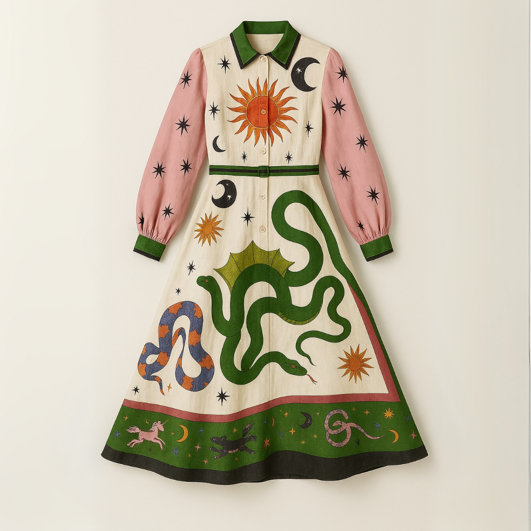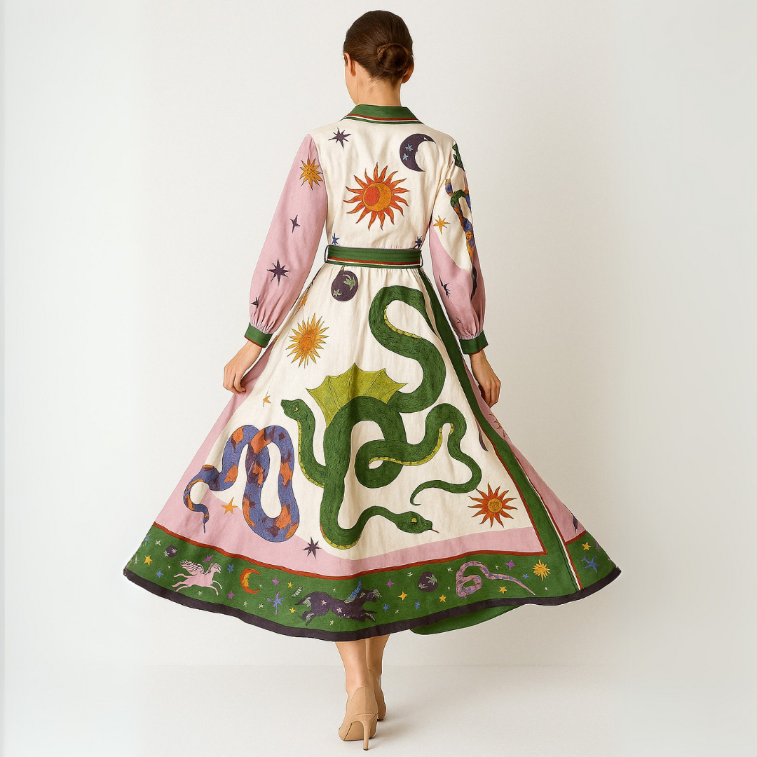 The VERA dress is a striking piece that combines bold artistic motifs with effortless elegance. With a vibrant print, voluminous sleeves and a belted waist, this dress is perfect for lovers of unique and luxurious fashion. Whether for a chic daytime look or a chic event, the VERA dress embodies Italian sophistication.