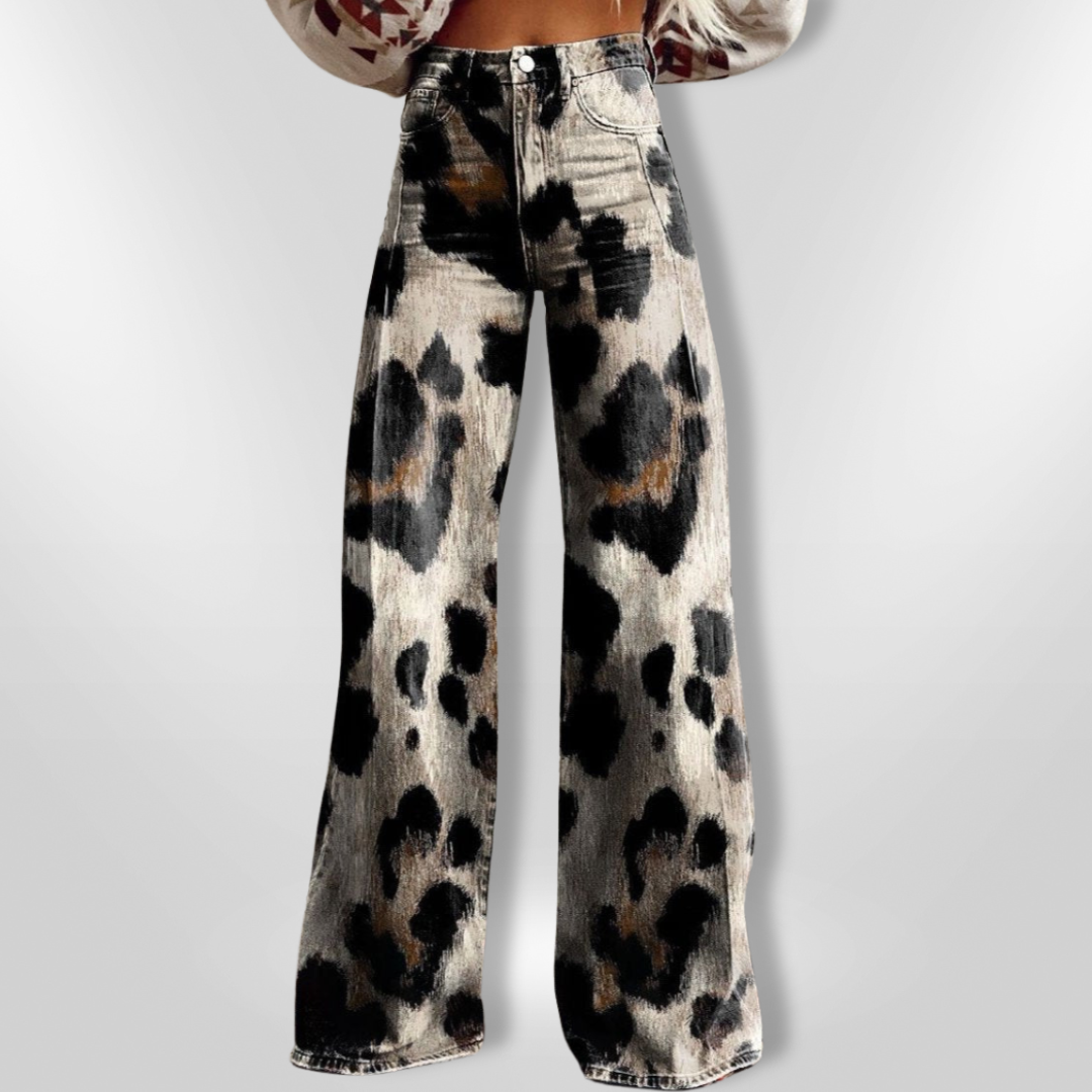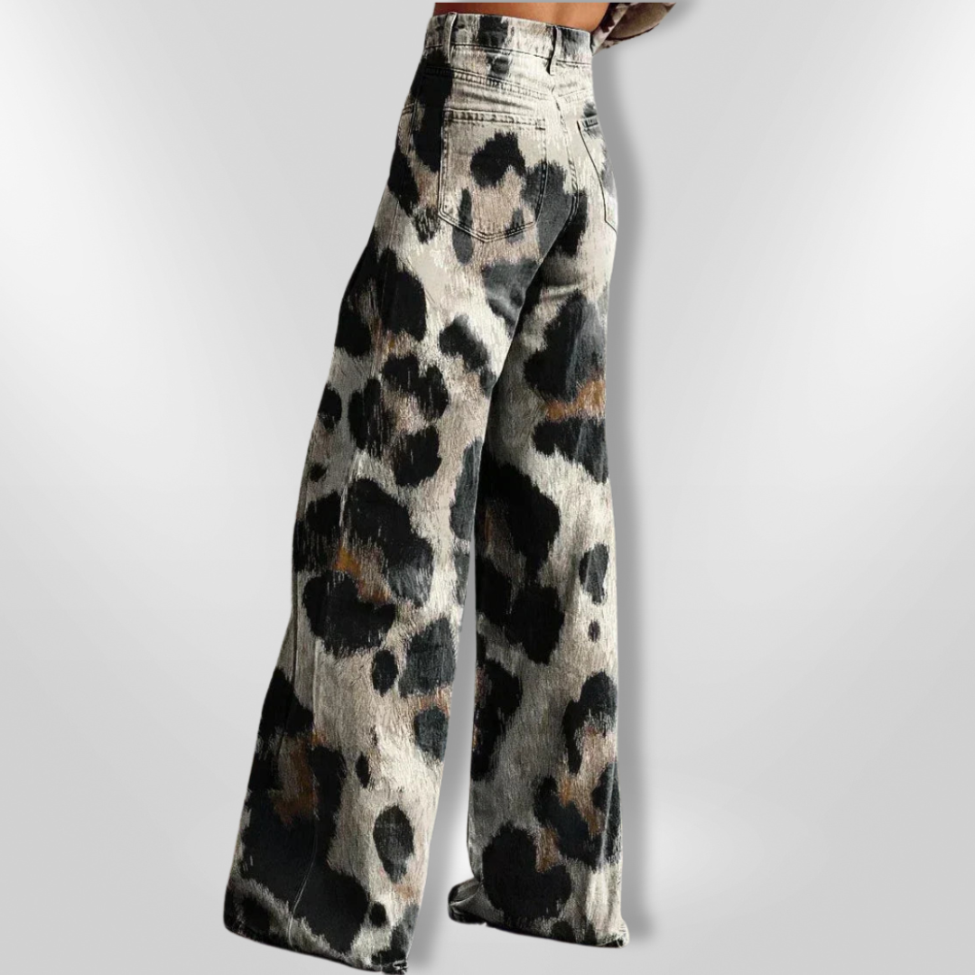 The LEONA | Vintage Flared Pants add a bold, wild energy to your wardrobe with their striking animal print. These pants feature a flattering high waist and wide legs, giving you a striking look and optimum comfort all day long. Ideal for adding a bold touch to any outfit. Perfect for those who like to stand out.